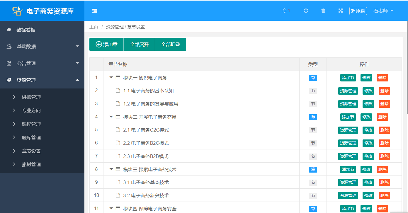 教師端的(de)基礎(chu)數據包(bao)括數據看板,基礎(chu)數據,公告管(guan)(guan)理,資源管(guan)(guan)理。數據統(tong)(tong)計(ji)(ji)包(bao)括班級統(tong)(tong)計(ji)(ji),學生統(tong)(tong)計(ji)(ji),專業方(fang)向,課程統(tong)(tong)計(ji)(ji),講(jiang)師統(tong)(tong)計(ji)(ji),素材統(tong)(tong)計(ji)(ji),報表統(tong)(tong)計(ji)(ji)等。