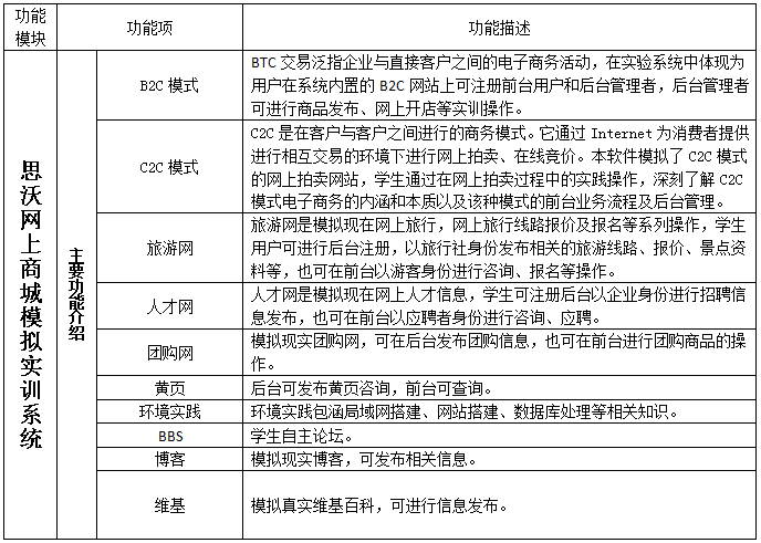 思沃網(wang)(wang)(wang)上(shang)商城(cheng)模(mo)擬(ni)實訓(xun)系(xi)(xi)統(tong)(tong)充分考慮到了(le)試驗(yan)的(de)具體(ti)情況,系(xi)(xi)統(tong)(tong)針對網(wang)(wang)(wang)上(shang)商城(cheng)模(mo)擬(ni)實訓(xun)進行相關配(pei)置,學生可在(zai)系(xi)(xi)統(tong)(tong)中(zhong)體(ti)驗(yan)網(wang)(wang)(wang)上(shang)B2C、C2C模(mo)擬(ni)商城(cheng)開店實訓(xun)并結合網(wang)(wang)(wang)絡環境的(de)搭建、數據(ju)庫運用知識(shi)、團購網(wang)(wang)(wang)、在(zai)線旅游網(wang)(wang)(wang)、在(zai)線人才網(wang)(wang)(wang)等進行多元性的(de)實訓(xun)系(xi)(xi)統(tong)(tong)。