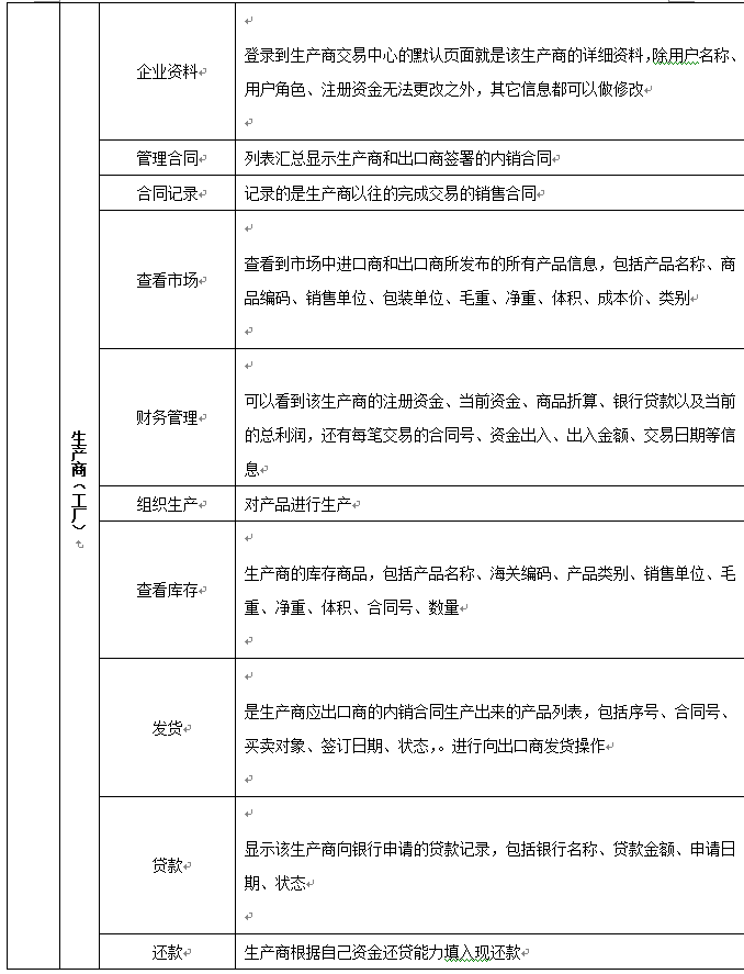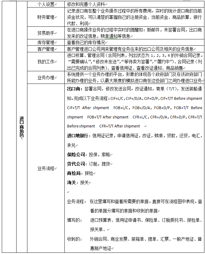 7、可以配置進(jin)口(kou)商、出(chu)(chu)(chu)口(kou)商、進(jin)口(kou)地(di)銀(yin)(yin)(yin)行、出(chu)(chu)(chu)口(kou)地(di)銀(yin)(yin)(yin)行、國稅局(ju)、海關(guan)、商檢局(ju)、保險(xian)公(gong)司、貨代公(gong)司、外(wai)(wai)匯管理局(ju)等相關(guan)參數和業務(wu),在實訓(xun)(xun)過程中可以分(fen)組、分(fen)角色進(jin)行互動、交互式訓(xun)(xun)練。角色扮演:出(chu)(chu)(chu)口(kou)商、進(jin)口(kou)商、生產商(工廠)、進(jin)口(kou)銀(yin)(yin)(yin)行、出(chu)(chu)(chu)口(kou)銀(yin)(yin)(yin)行、保險(xian)公(gong)司、商檢局(ju)、海關(guan)、外(wai)(wai)匯管理局(ju)、貨代、國稅局(ju)