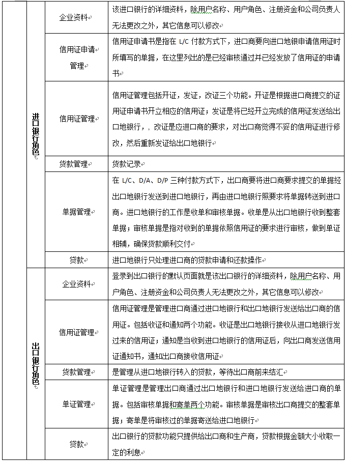 信用證(zheng)管理 :信用證(zheng)管理是管理進口(kou)商通過進口(kou)地銀(yin)行和(he)出(chu)口(kou)地銀(yin)行發送給出(chu)口(kou)商的信用證(zheng)。包括收證(zheng)和(he)通知兩個(ge)功能。