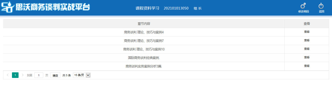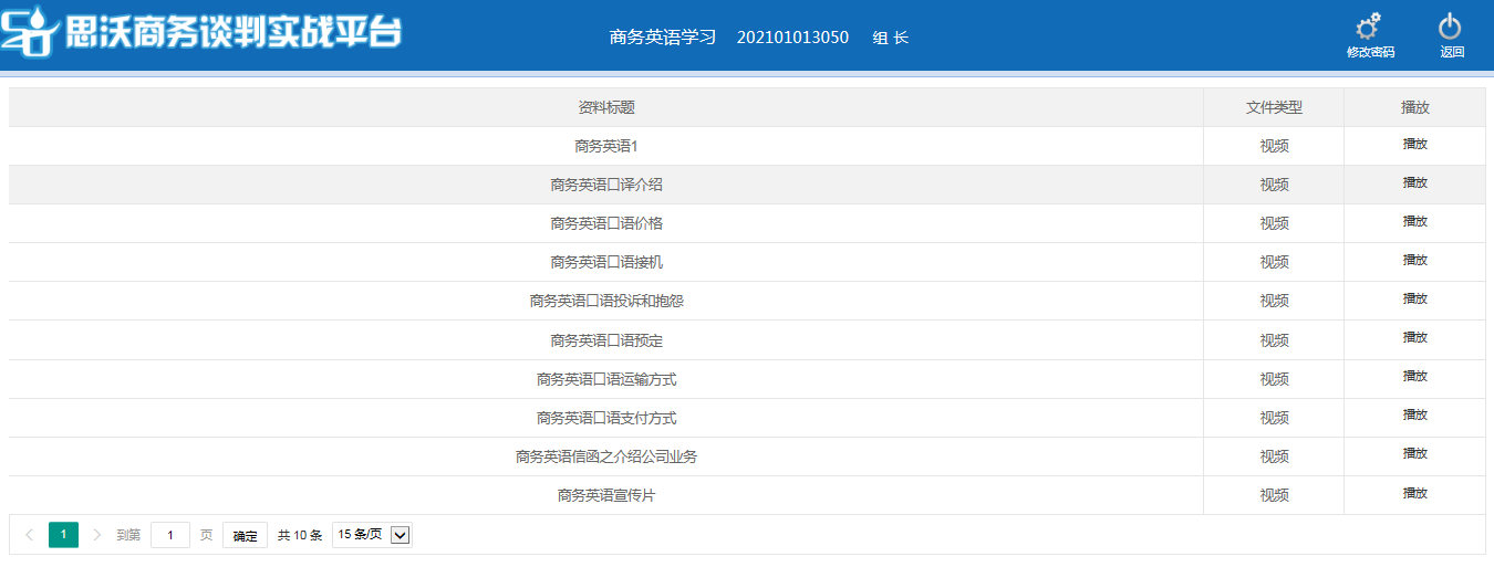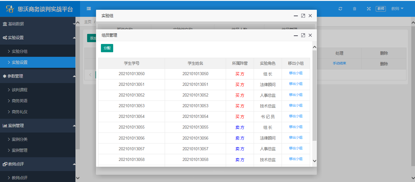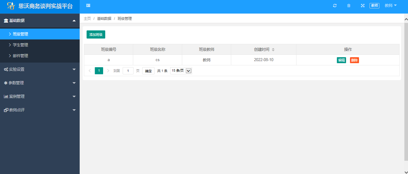 教(jiao)師(shi)端包括:基礎(chu)數(shu)據(ju)(班級管(guan)理(li)、學生管(guan)理(li)、郵(you)件管(guan)理(li));實驗(yan)(yan)設(she)置(實驗(yan)(yan)分組(zu)、實驗(yan)(yan)設(she)置);參(can)數(shu)管(guan)理(li)(談(tan)判(pan)(pan)課程、商務英語、商務禮儀);案例(li)管(guan)理(li)(案例(li)分類、案例(li)管(guan)理(li));教(jiao)師(shi)點評(教(jiao)師(shi)點評、教(jiao)師(shi)點評庫、視頻回放(fang)、談(tan)判(pan)(pan)得(de)分)。