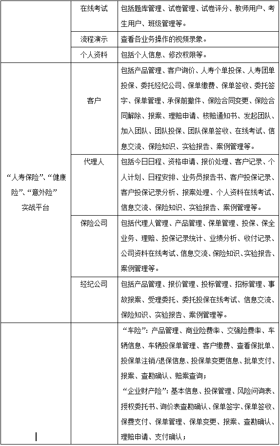 學(xue)生(sheng)通過飾(shi)演保(bao)(bao)(bao)險(xian)(xian)業(ye)務(wu)流程(cheng)中的客戶、代理(li)人(ren)、經紀公司(si)、人(ren)壽保(bao)(bao)(bao)險(xian)(xian)公司(si)、財產(chan)(chan)保(bao)(bao)(bao)險(xian)(xian)公司(si)五種角色,進(jin)入“人(ren)壽保(bao)(bao)(bao)險(xian)(xian)”和“財產(chan)(chan)保(bao)(bao)(bao)險(xian)(xian)”實踐(jian)平臺,從展業(ye)投保(bao)(bao)(bao)環節開始,至索賠(pei)理(li)賠(pei)為止(zhi),全面操(cao)練保(bao)(bao)(bao)險(xian)(xian)核心業(ye)務(wu)中的投保(bao)(bao)(bao)、承保(bao)(bao)(bao)、核保(bao)(bao)(bao)、變(bian)更、理(li)賠(pei)、核賠(pei)等(deng)流程(cheng),使學(xue)生(sheng)的知識結構提(ti)升,彌補(bu)實踐(jian)業(ye)務(wu)操(cao)作的缺(que)乏,實現對人(ren)壽保(bao)(bao)(bao)險(xian)(xian)、運輸(shu)工(gong)具車(che)輛(liang)險(xian)(xian)、企業(ye)財產(chan)(chan)險(xian)(xian)、家庭財產(chan)(chan)險(xian)(xian)、海洋運輸(shu)貨(huo)物保(bao)(bao)(bao)險(xian)(xian)、運輸(shu)工(gong)具船舶險(xian)(xian)、責任險(xian)(xian)、工(gong)程(cheng)險(xian)(xian)的熟悉(xi)、掌握,對保(bao)(bao)(bao)險(xian)(xian)業(ye)務(wu)的主要工(gong)作流程(cheng)有一個(ge)清晰的輪廓,為學(xue)以致用打(da)下堅(jian)固(gu)的基礎。