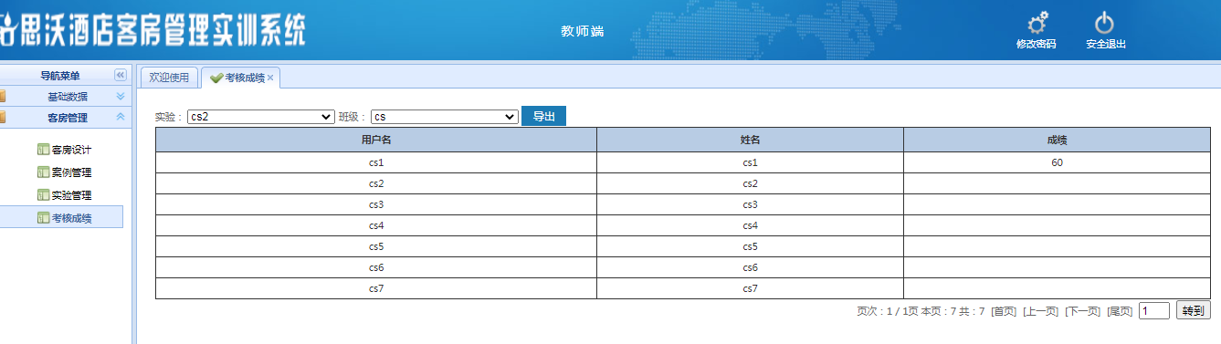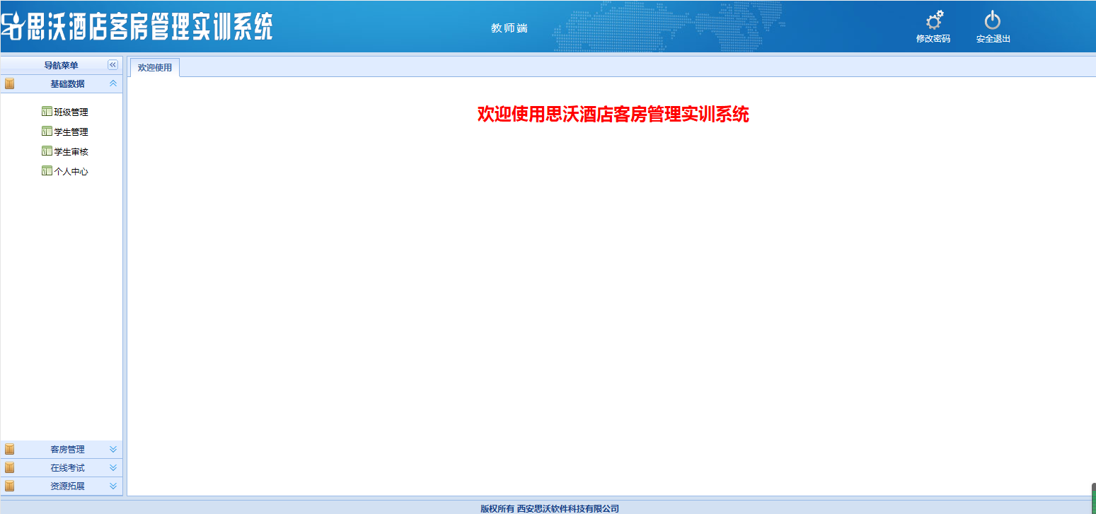 教師登(deng)陸界(jie)面(mian):基礎數據、客房(fang)管理,在線考試,資源拓展(zhan)每個(ge)大模塊(kuai)下分別有相(xiang)應的子模塊(kuai)。