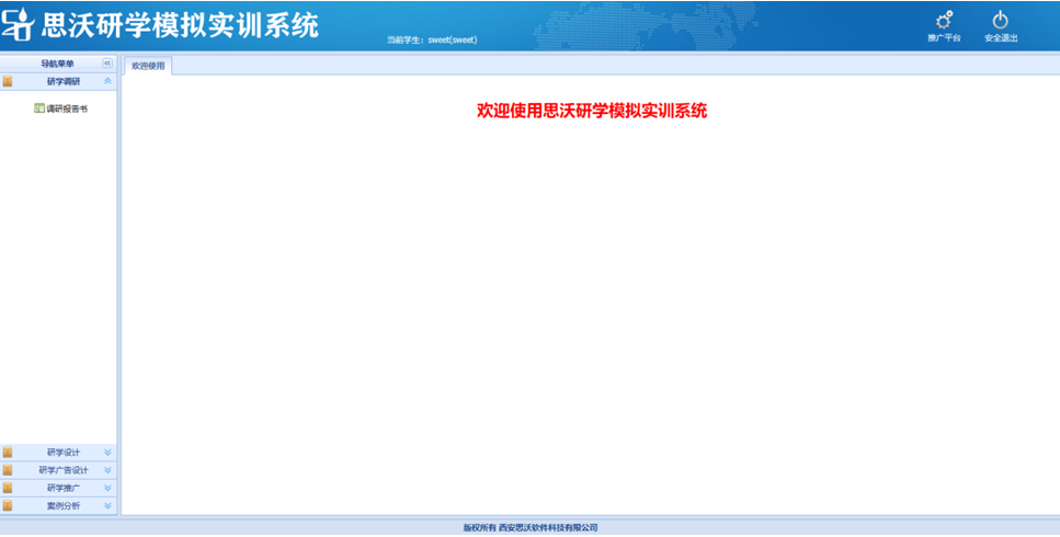 思沃研(yan)(yan)(yan)學(xue)模(mo)擬(ni)實訓系(xi)(xi)統分為管理員,教師,學(xue)生(sheng)三(san)種角色,功能包(bao)括(kuo)推(tui)(tui)廣(guang)(guang)(guang)平臺、首頁,知識庫,研(yan)(yan)(yan)學(xue)推(tui)(tui)廣(guang)(guang)(guang),圖文結合廣(guang)(guang)(guang)告,媒體(ti)推(tui)(tui)送廣(guang)(guang)(guang)告,研(yan)(yan)(yan)學(xue)調研(yan)(yan)(yan),研(yan)(yan)(yan)學(xue)設計(ji)等。學(xue)生(sheng)通過模(mo)擬(ni)實訓體(ti)驗從研(yan)(yan)(yan)學(xue)內容調研(yan)(yan)(yan)、研(yan)(yan)(yan)學(xue)路(lu)線(xian)設計(ji)、研(yan)(yan)(yan)學(xue)核心價(jia)值發掘、研(yan)(yan)(yan)學(xue)媒體(ti)網絡(luo)推(tui)(tui)廣(guang)(guang)(guang)等一系(xi)(xi)列(lie)工作(zuo)內容。 研(yan)(yan)(yan)學(xue)軟件包(bao)含案例(li)分析,點評,研(yan)(yan)(yan)學(xue)線(xian)路(lu)設計(ji),團隊類(lei)(lei)型(xing),機型(xing),小交通標準(zhun)(zhun),出入境口岸,匯率維(wei)護(hu),酒店(dian)(dian)類(lei)(lei)型(xing),研(yan)(yan)(yan)學(xue)類(lei)(lei)型(xing)知識庫類(lei)(lei)型(xing),案例(li)類(lei)(lei)型(xing),航(hang)空公司(si),線(xian)路(lu)區域,團隊等級(ji),住宿(su)標準(zhun)(zhun),大(da)交通標準(zhun)(zhun),門票標準(zhun)(zhun),餐飲標準(zhun)(zhun),導游證類(lei)(lei)別,酒店(dian)(dian)等級(ji),客戶(hu)(hu)行業分類(lei)(lei),客戶(hu)(hu)等級(ji)分類(lei)(lei),客戶(hu)(hu)關系(xi)(xi)深度,地接車(che)等級(ji),客戶(hu)(hu)接受程度,國(guo)家維(wei)護(hu),省份(fen)維(wei)護(hu),城市維(wei)護(hu),景點類(lei)(lei)型(xing),學(xue)生(sheng)可以進行系(xi)(xi)統的模(mo)擬(ni)學(xue)習。