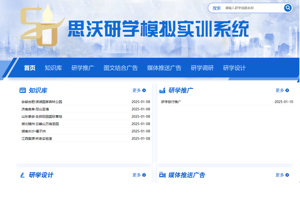 推(tui)廣(guang)平(ping)臺包括首頁,知識庫,研(yan)學(xue)(xue)推(tui)廣(guang),圖文結合(he)廣(guang)告,媒體推(tui)送(song)廣(guang)告,研(yan)學(xue)(xue)調研(yan),研(yan)學(xue)(xue)設計等模塊。