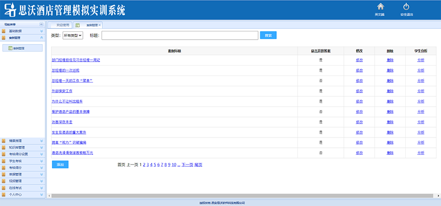 案例分析:提供(gong)豐富(fu)多樣(yang)的專業(ye)實訓案例任務,數量(liang)不少于200個(ge)。案例涵蓋酒店運營過程(cheng)中的各種(zhong)常(chang)見場景與突(tu)發問題(ti)(ti),如客戶投(tou)訴處理(li)、特殊訂(ding)單安排、資(zi)源調配難題(ti)(ti)等,幫助學(xue)生將理(li)論知識應用于實際情(qing)境,培養(yang)學(xue)生分析問題(ti)(ti)與解(jie)決問題(ti)(ti)的能力。?