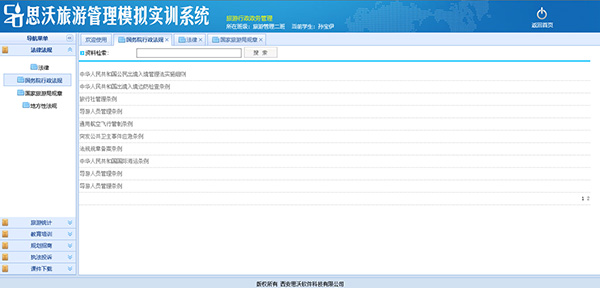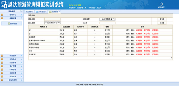 思(si)沃旅(lv)游(you)管(guan)理(li)(li)模(mo)擬(ni)實(shi)(shi)訓(xun)系(xi)統(tong)分(fen)為(wei)模(mo)擬(ni)操(cao)作(zuo)和旅(lv)游(you)知識練習兩大模(mo)塊(kuai),涵(han)蓋旅(lv)行(xing)社業的分(fen)銷(xiao)、操(cao)作(zuo)、結算、統(tong)計分(fen)析(xi)等各大業務(wu)模(mo)塊(kuai),該實(shi)(shi)訓(xun)教(jiao)學(xue)(xue)(xue)(xue)平臺軟(ruan)(ruan)(ruan)件具(ju)備(bei)團隊計劃、旅(lv)游(you)預(yu)訂(ding)、客(ke)房預(yu)訂(ding)、機(ji)票(piao)預(yu)訂(ding)、景(jing)點門票(piao)預(yu)訂(ding)、團餐預(yu)訂(ding)、車輛預(yu)訂(ding)、收(shou)付款(kuan)管(guan)理(li)(li)、供(gong)應商、團隊客(ke)戶(hu)、VIP散客(ke)管(guan)理(li)(li)等功能。從旅(lv)行(xing)社經營(ying)管(guan)理(li)(li)、酒店(dian)經營(ying)管(guan)理(li)(li)、旅(lv)游(you)資(zi)源開發與(yu)管(guan)理(li)(li)、旅(lv)游(you)行(xing)政(zheng)管(guan)理(li)(li)、導游(you)實(shi)(shi)務(wu)與(yu)技(ji)巧五個(ge)方面(mian)(mian)讓學(xue)(xue)(xue)(xue)生參與(yu)旅(lv)游(you)管(guan)理(li)(li)的模(mo)擬(ni)操(cao)作(zuo),每個(ge)方面(mian)(mian)又細(xi)分(fen)為(wei)實(shi)(shi)際(ji)流程(cheng)中(zhong)(zhong)涉及的每個(ge)細(xi)節,因此,學(xue)(xue)(xue)(xue)生可以(yi)從中(zhong)(zhong)學(xue)(xue)(xue)(xue)習到(dao)旅(lv)游(you)管(guan)理(li)(li)的全面(mian)(mian)的操(cao)作(zuo)流程(cheng)。此外,軟(ruan)(ruan)(ruan)件中(zhong)(zhong)教(jiao)師端對應的實(shi)(shi)驗(yan)(yan)設置(zhi),讓教(jiao)師可以(yi)方便地為(wei)學(xue)(xue)(xue)(xue)生設置(zhi)實(shi)(shi)驗(yan)(yan)的不同因素,同時(shi),教(jiao)師還可以(yi)查(cha)看學(xue)(xue)(xue)(xue)生的操(cao)作(zuo)結果,從而能夠(gou)對學(xue)(xue)(xue)(xue)生的實(shi)(shi)驗(yan)(yan)進(jin)行(xing)評價。教(jiao)學(xue)(xue)(xue)(xue)軟(ruan)(ruan)(ruan)件系(xi)統(tong)的使用可以(yi)提(ti)高學(xue)(xue)(xue)(xue)生的學(xue)(xue)(xue)(xue)習興趣,同時(shi)也為(wei)教(jiao)師減輕工作(zuo)負擔。本(ben)公司為(wei)了更好滿足高校(xiao)的教(jiao)學(xue)(xue)(xue)(xue)需(xu)求,會(hui)根據高校(xiao)的需(xu)求提(ti)供(gong)旅(lv)游(you)管(guan)理(li)(li)實(shi)(shi)訓(xun)室解(jie)決方案(an)。