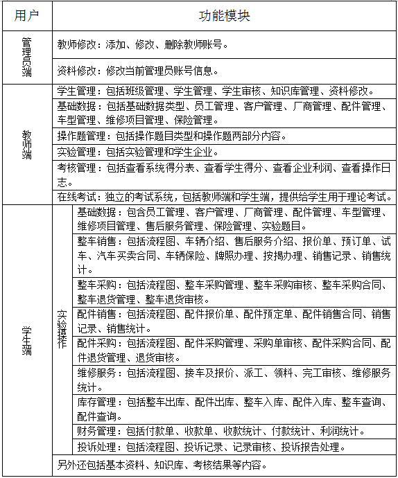 系統分(fen)為三個權(quan)限端(duan)口,管(guan)(guan)(guan)理(li)(li)員(yuan)端(duan)、教(jiao)(jiao)師(shi)端(duan)和學生端(duan)。教(jiao)(jiao)師(shi)除對學生、班級進行管(guan)(guan)(guan)理(li)(li)外(wai),對實驗(yan)(yan)(yan)的管(guan)(guan)(guan)理(li)(li)尤(you)為重(zhong)要。不僅可以(yi)設置(zhi)實驗(yan)(yan)(yan)基(ji)礎數據,包括(kuo)員(yuan)工管(guan)(guan)(guan)理(li)(li)、客戶管(guan)(guan)(guan)理(li)(li)、廠(chang)商管(guan)(guan)(guan)理(li)(li)、配件管(guan)(guan)(guan)理(li)(li)、車型(xing)管(guan)(guan)(guan)理(li)(li)、維(wei)修項目管(guan)(guan)(guan)理(li)(li)、保險管(guan)(guan)(guan)理(li)(li)等(deng)。還可以(yi)對實驗(yan)(yan)(yan)狀態進行控制(zhi)。系統記錄學生操作得分(fen)、企業利潤(run)、操作日志等(deng),便于(yu)教(jiao)(jiao)師(shi)更好的進行教(jiao)(jiao)學安排。
