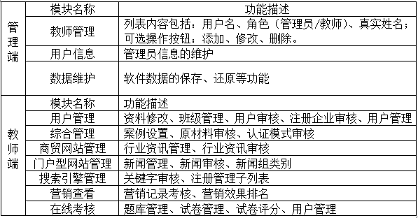 (3)教師端:為(wei)模擬(ni)全真的(de)(de)電子商務環境(jing),系統設(she)(she)(she)置(zhi)是對學生交易環境(jing)中的(de)(de)各(ge)種參數進行設(she)(she)(she)置(zhi),教師能(neng)在此(ci)設(she)(she)(she)置(zhi)產品庫管(guan)理(li)、物(wu)流車輛庫管(guan)理(li)、審核(he)(he)模式設(she)(she)(she)置(zhi)、政府(fu)采購(gou)信息、進口(kou)采購(gou)信息、行業資訊管(guan)理(li)、行業資訊審核(he)(he)、門(men)戶(hu)新聞管(guan)理(li)、門(men)戶(hu)新聞審核(he)(he)、搜索關(guan)鍵字審核(he)(he)、項目交易平臺審核(he)(he)等。