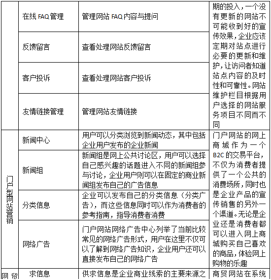 (2)企業網站(zhan)管(guan)理與營銷(xiao):模塊(kuai)什(shen)么時候需要維(wei)護?新(xin)聞(wen)管(guan)理有(you)何(he)用處?如何(he)管(guan)理網站(zhan)會員?FAQ對網站(zhan)有(you)什(shen)么幫助?是(shi)否(fou)留意(yi)反饋信息?是(shi)否(fou)解決(jue)顧客投訴?是(shi)否(fou)需要友情鏈(lian)接?