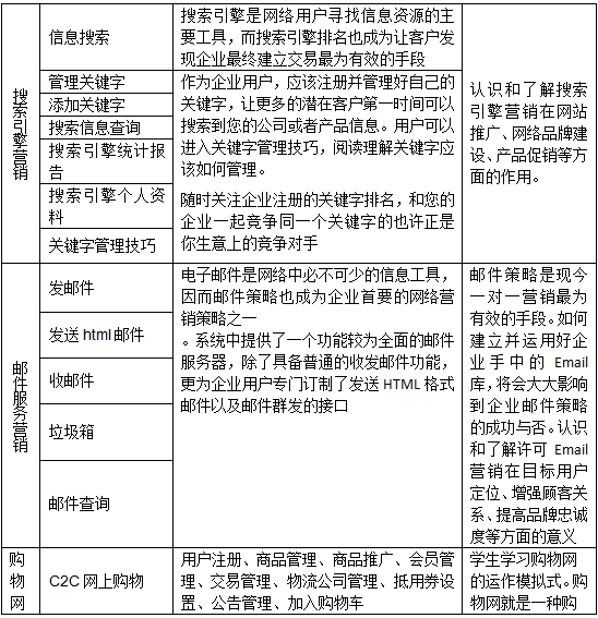 1、軟件用(yong)戶從初次訪問企業(ye)網(wang)站(zhan)(zhan)到(dao)跟該企業(ye)訂(ding)購產品的(de)整(zheng)個過程,可將其分成三個階段(duan):網(wang)站(zhan)(zhan)建設階段(duan)、營銷(xiao)推廣階段(duan)和(he)在線業(ye)務(wu)管理階段(duan)。模塊中(zhong)應(ying)包(bao)括:網(wang)站(zhan)(zhan)建設、搜(sou)索(suo)引(yin)擎營銷(xiao)、郵件推廣、網(wang)絡(luo)溝通、信息搜(sou)索(suo)與發布、搜(sou)索(suo)引(yin)擎優(you)化(hua)、網(wang)絡(luo)廣告(gao)制(zhi)作、、客戶服務(wu)、在線銷(xiao)售等技(ji)能的(de)專項實(shi)訓(xun),也能將專項實(shi)訓(xun)匯總,方(fang)便(bian)學(xue)生開展企業(ye)網(wang)站(zhan)(zhan)綜(zong)合營銷(xiao)、作出網(wang)絡(luo)營銷(xiao)效果(guo)評估等的(de)集中(zhong)實(shi)訓(xun)。
