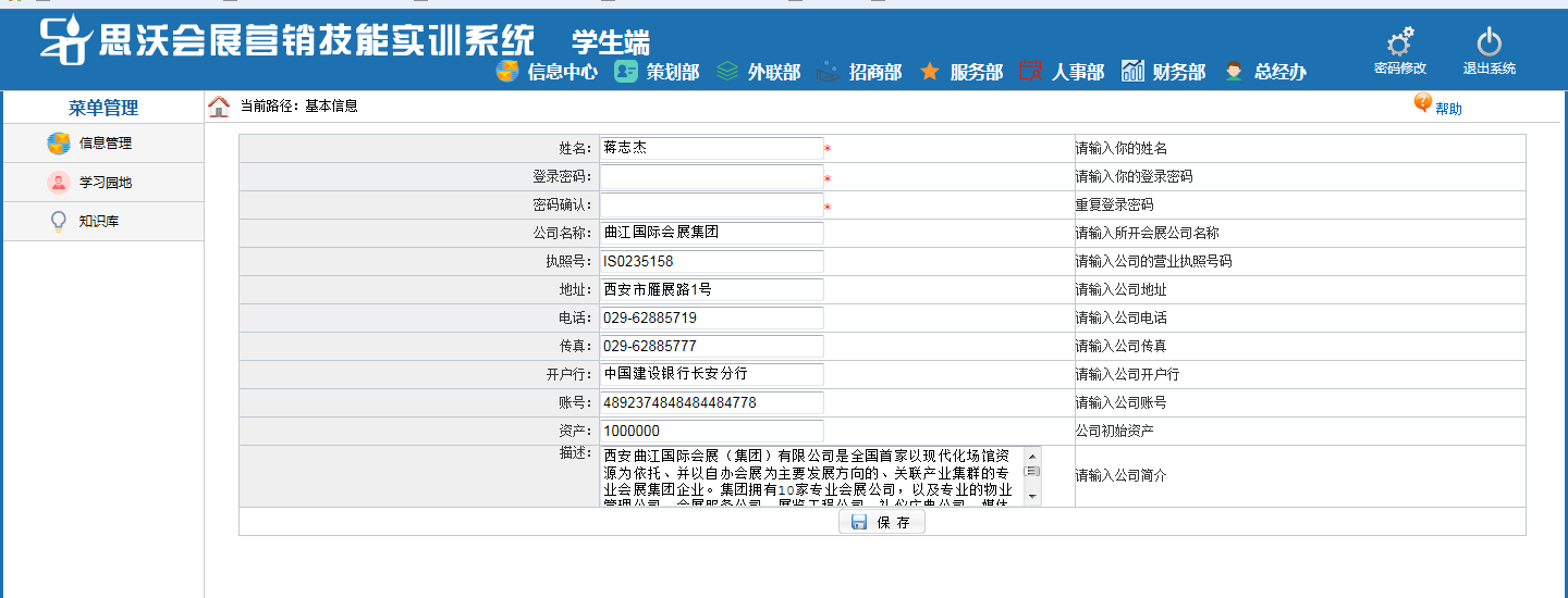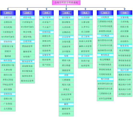 思沃(wo)會(hui)展(zhan)營銷模(mo)擬(ni)實(shi)訓系統(tong)以(yi)模(mo)擬(ni)會(hui)展(zhan)公(gong)司的(de)(de)策劃部、外聯部、招商部、會(hui)展(zhan)服務(wu)(wu)(wu)部、人事部、財(cai)務(wu)(wu)(wu)部以(yi)及總經辦7大業(ye)(ye)務(wu)(wu)(wu)部門(men)為基礎而展(zhan)開實(shi)驗操作(zuo)的(de)(de)。該教學(xue)(xue)(xue)(xue)平臺軟件業(ye)(ye)務(wu)(wu)(wu)內容包括(kuo)了(le):項(xiang)(xiang)目(mu)上報審批(pi)、項(xiang)(xiang)目(mu)的(de)(de)策劃安排(pai)、服務(wu)(wu)(wu)商管(guan)理(li)(li)、人事招聘與(yu)管(guan)理(li)(li)、會(hui)展(zhan)的(de)(de)現場(chang)服務(wu)(wu)(wu)與(yu)合同管(guan)理(li)(li)等(deng)等(deng),讓學(xue)(xue)(xue)(xue)生(sheng)通過實(shi)驗感受會(hui)展(zhan)項(xiang)(xiang)目(mu)的(de)(de)系統(tong)化(hua)管(guan)理(li)(li)流程與(yu)業(ye)(ye)務(wu)(wu)(wu)操作(zuo)內容,不但能夠了(le)解會(hui)展(zhan)項(xiang)(xiang)目(mu)從(cong)(cong)立項(xiang)(xiang)審批(pi)到策劃、宣傳、招展(zhan)招商、現場(chang)服務(wu)(wu)(wu)以(yi)及會(hui)后(hou)總結各(ge)個(ge)(ge)環節的(de)(de)業(ye)(ye)務(wu)(wu)(wu),同時還可以(yi)掌握各(ge)種文案(an)的(de)(de)寫作(zuo)技巧,從(cong)(cong)而讓學(xue)(xue)(xue)(xue)生(sheng)真正(zheng)的(de)(de)理(li)(li)解并掌握會(hui)展(zhan)這一行業(ye)(ye)的(de)(de)各(ge)種知識(shi)與(yu)業(ye)(ye)務(wu)(wu)(wu)要求。為學(xue)(xue)(xue)(xue)生(sheng)以(yi)后(hou)的(de)(de)工(gong)作(zuo)、學(xue)(xue)(xue)(xue)習(xi)提供了(le)一個(ge)(ge)實(shi)戰(zhan)演練的(de)(de)實(shi)訓平臺,增強了(le)學(xue)(xue)(xue)(xue)生(sheng)進入工(gong)作(zuo)崗位后(hou)的(de)(de)實(shi)力。